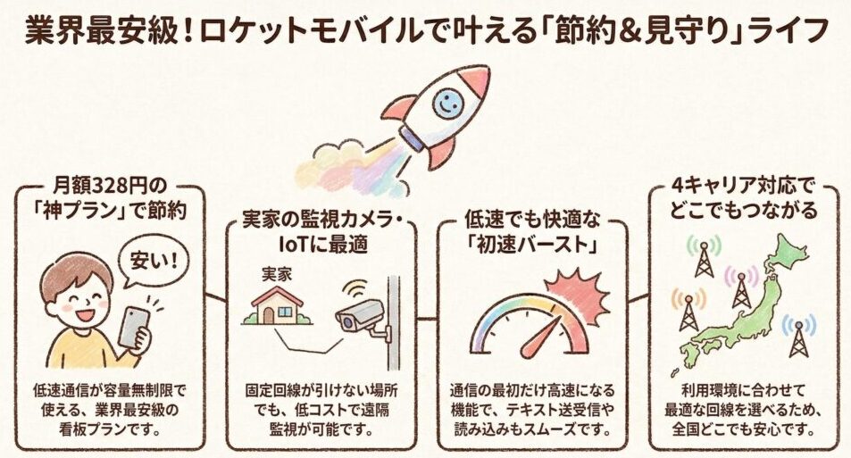 ロケットモバイルの神プラン!スマホ代と実家の防犯を激安に