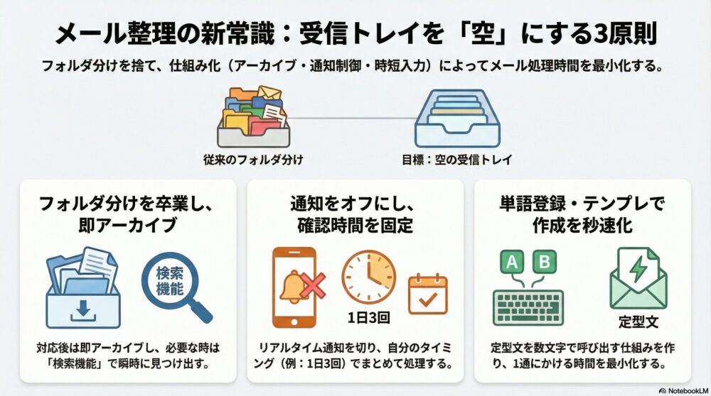 メール整理の仕方は「フォルダを増やすこと」ではなく、「アーカイブ・通知制御・時短入力」の3つを仕組み化することにあります。