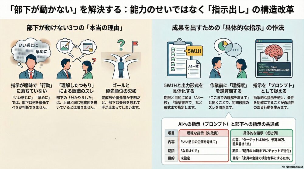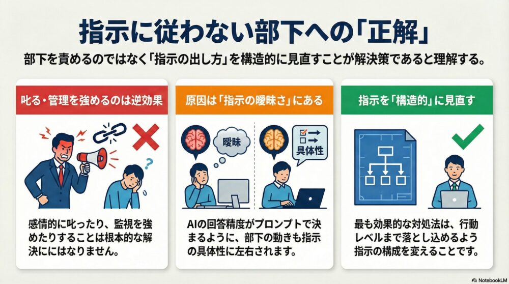 指示に従わない部下への最も効果的な対処法は、叱ることでも管理を強めることでもなく、「指示の出し方を構造的に見直すこと」