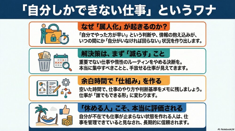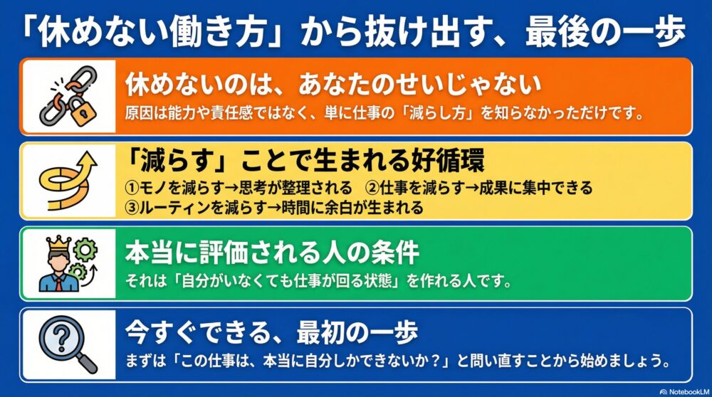 まとめ|「自分しかできない仕事」がある限り、あなたは休めない