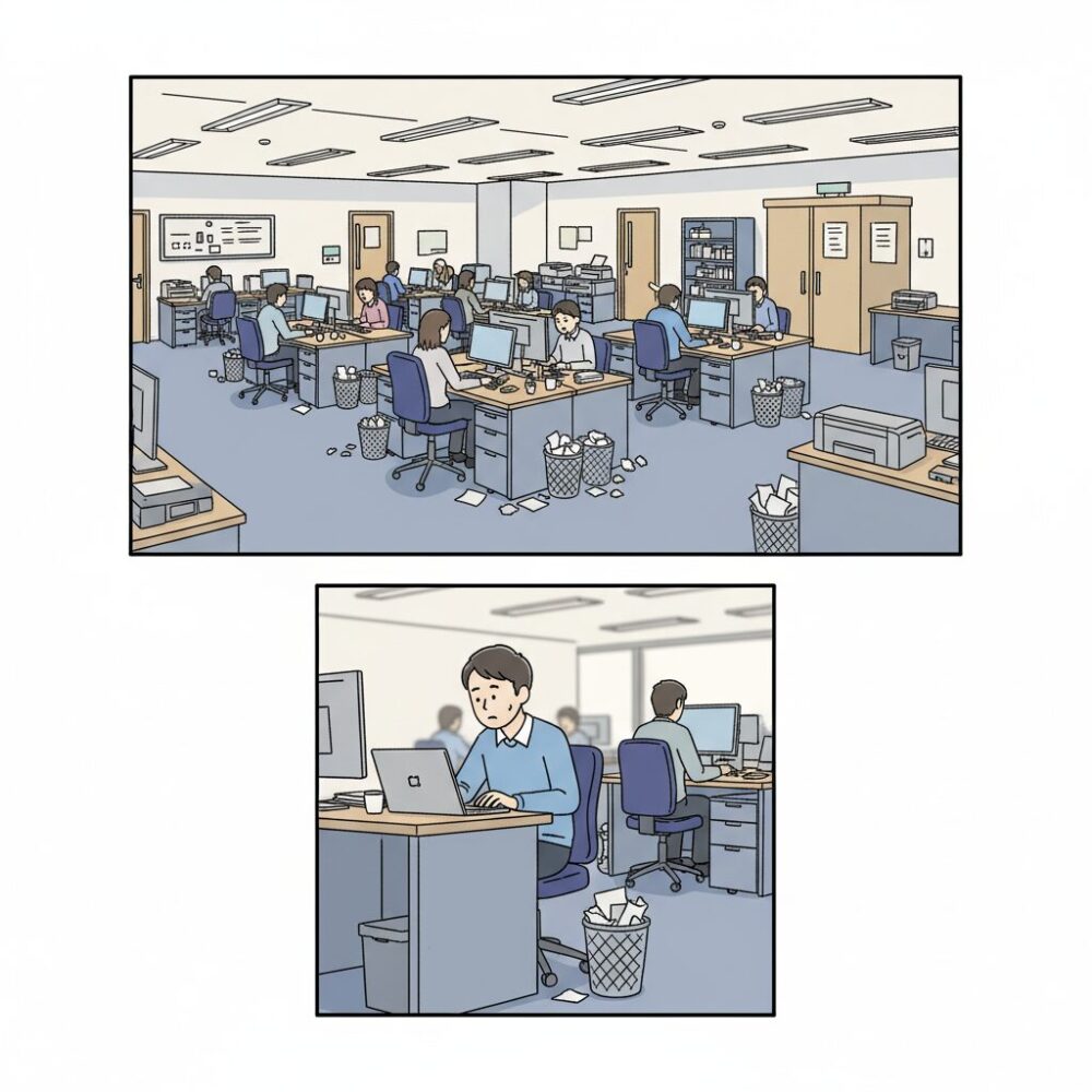 そんな軽い気持ちで、気づけばオフィス中にゴミ箱が乱立…。 社員一人ひとりの「楽をしたい」という気持ちが積み重なって、