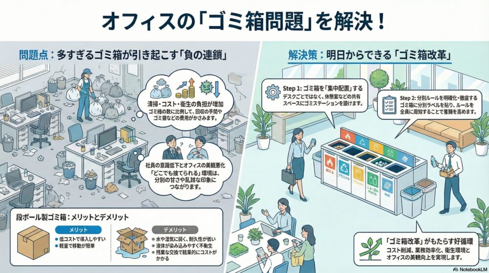 便利さを追求するあまり、気づけば各デスクに1つ、会議室に1つ、休憩室に1つ…と、ゴミ箱が増殖しているかもしれません。