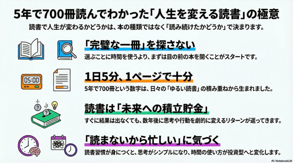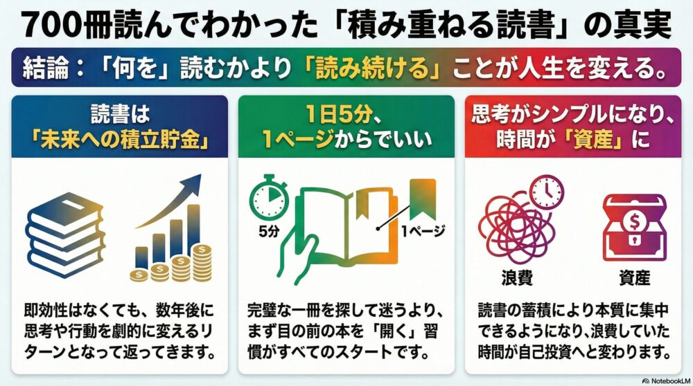 5年間で700冊を読み重ねてきた私が、最初に伝えたい結論はとてもシンプルです。