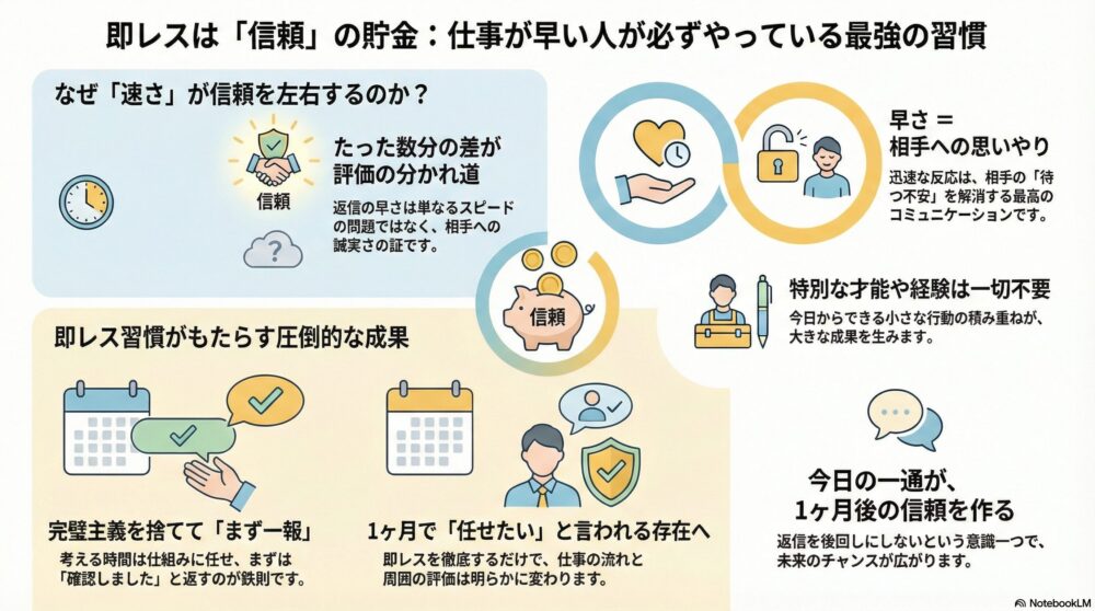特別な才能も、長い経験も必要ありません。今日からできる小さな行動の積み重ねが、大きな信頼と成果を生むのです。この記事では、その“即レス体質”を身につける具体的な方法を、わかりやすく紹介していきます。