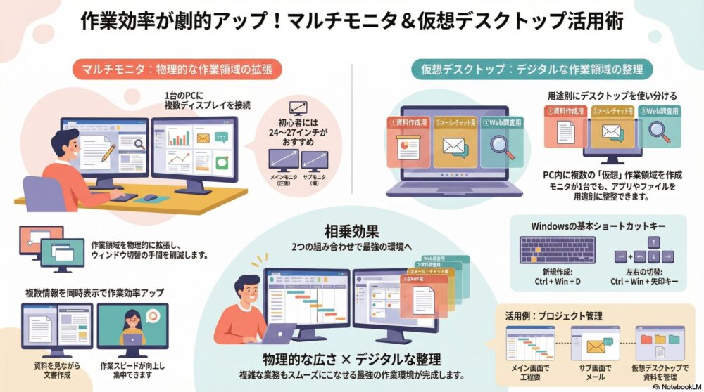 マルチモニタと仮想デスクトップを導入すると、視覚的な作業領域とデジタルな作業領域の両方を一挙に拡張できます。最初は設定やショートカットに戸惑うこともあるかもしれませんが、段階的に慣れれば手放せない便利さが得られるはずです。